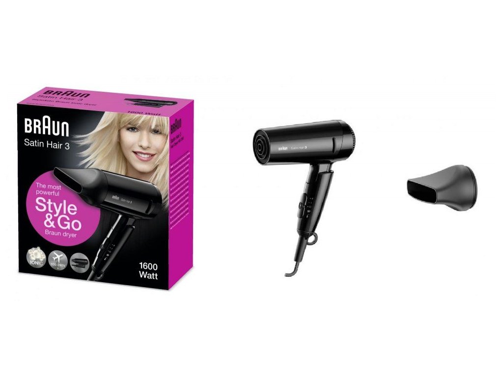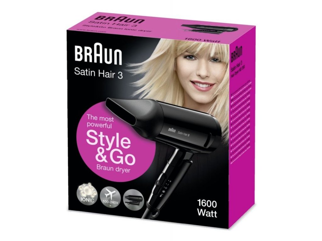 Braun Satin Hair 3 HD 350 To Go – nejvýkonější vysoušeč vlasů Style & Go s technologií Ionic. S výkonem 1600 Wattů je vysoušeč vlasů Satin Hair 3 ideálním nástrojem pro účinné vysoušení vlasů a jejich špičkovou ochranu. Vyberte si model HD 350 ideální na cesty. Díky optimální distribuci tepla, ochraně před přehřátím a lámáním vlasů a technologií Ionic vysoušeč Satin Hair 3 vaše vlasy při vysoušení ochrání. Vytvořte si úžasné účesy a užijte si skvělou úpravu zářivých a zdravě vypadajících vlasů – díky svému ergonomickému designu se vysoušeč vlasů Satin Hair 3 snadno a pohodlně používá v každém úhlu. Má skládatelnou rukojeť, takže je snadno skladovatelný v kufru nebo kabelce na cestách.